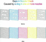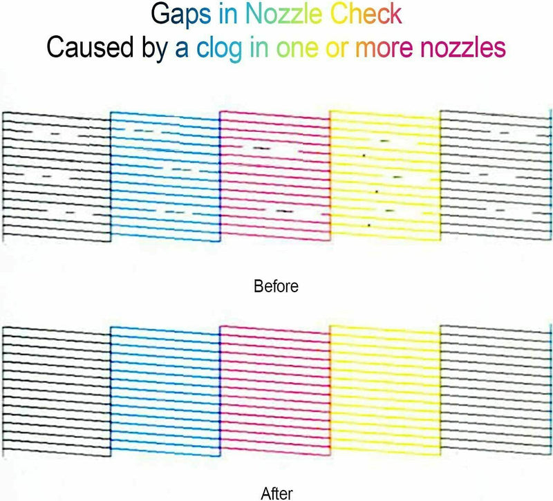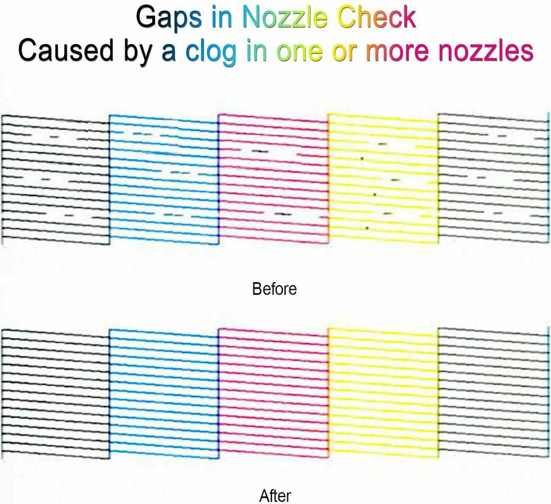 - To solve illegible marking caused by print head clogging (vertical stripes, text printing, horizontal stripes or incomplete patterns.). Fixes printers with discoloration, colors/black ink not printing, low quality prints, and lines when printing